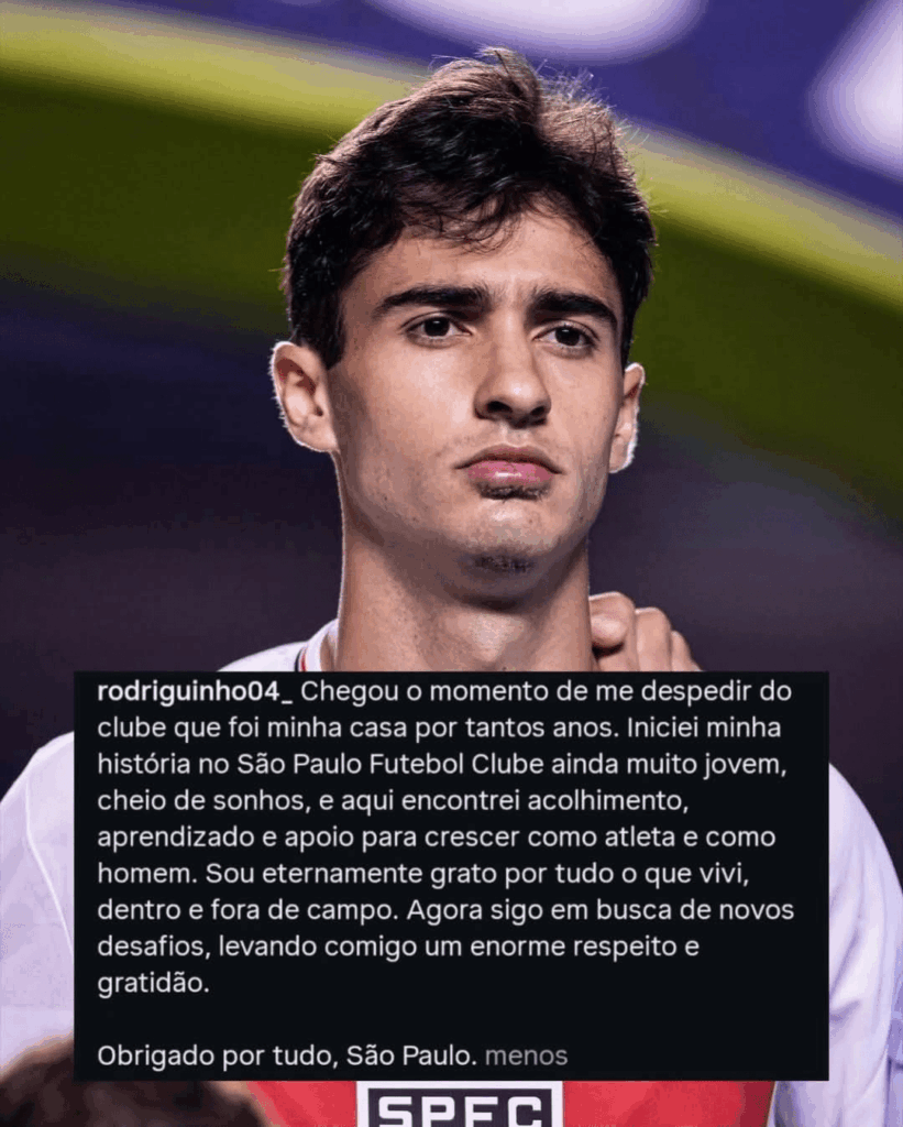 A mensagem de despedida de Rodriguinho transborda gratidão e emoção, refletindo a profundidade de sua ligação com o São Paulo. Deixar um clube onde se passou a maior parte da carreira e se viu crescer é sempre um momento de forte impacto. Embora o futuro imediato do meio-campista ainda não tenha sido detalhado, a expectativa é que ele busque novos desafios e oportunidades para continuar sua trajetória no futebol profissional, levando consigo a experiência e a paixão construídas ao longo de uma década no tricolor paulista.